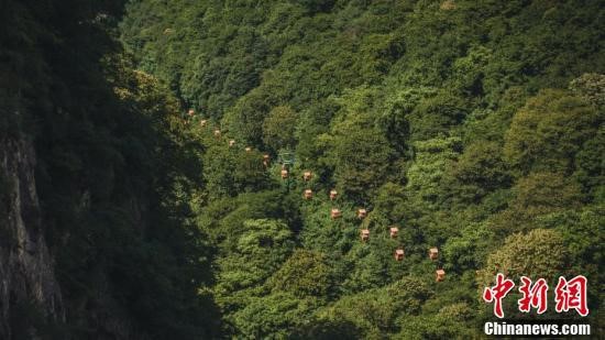 圖為游人乘坐纜車觀賞秦嶺風光。
