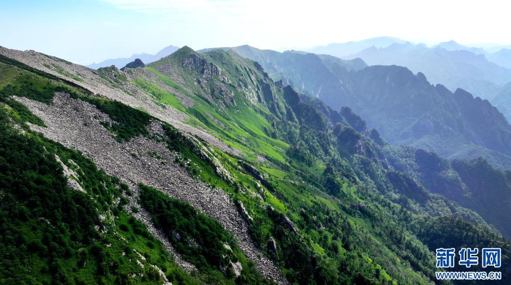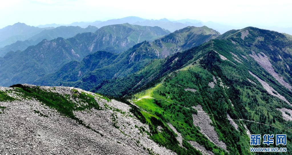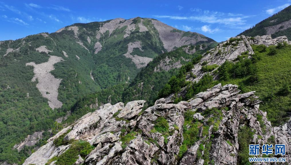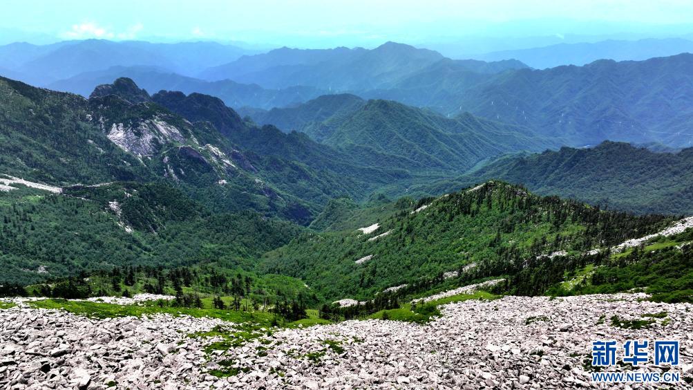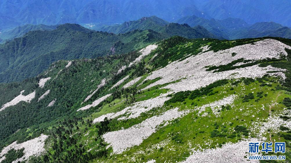 陜西朱雀國家森林公園內(nèi)石海及高山草甸景色(7月21日攝,無人機(jī)照片)。