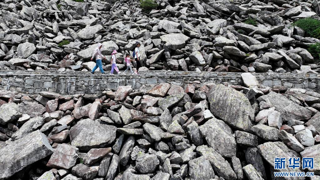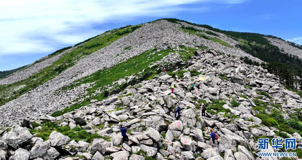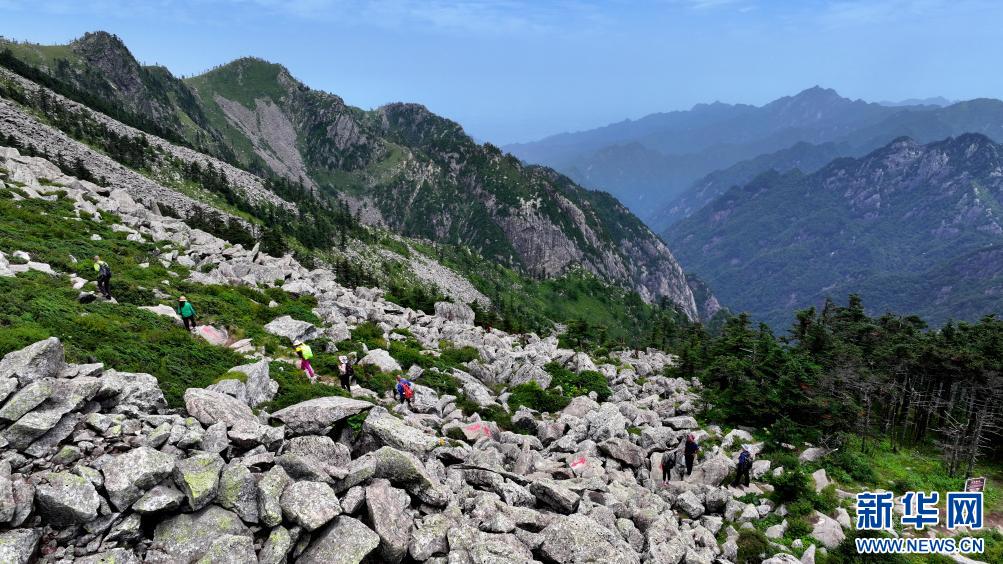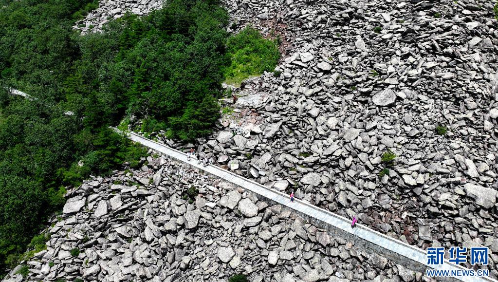游人經(jīng)過陜西朱雀國家森林公園內(nèi)的石海(7月21日攝,無人機(jī)照片)。公園內(nèi)的大面積石海,是典型的冰川侵蝕地貌,也是秦嶺地區(qū)冰川遺跡的代表。