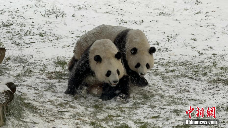 12月15日,西安迎來降雪天氣,在西安秦嶺野生動物園里,兩只憨態(tài)可掬的大熊貓來到戶外,在雪地里玩起了摔跤。時而互相追逐,時而摟抱在一起,玩得不亦樂乎。
