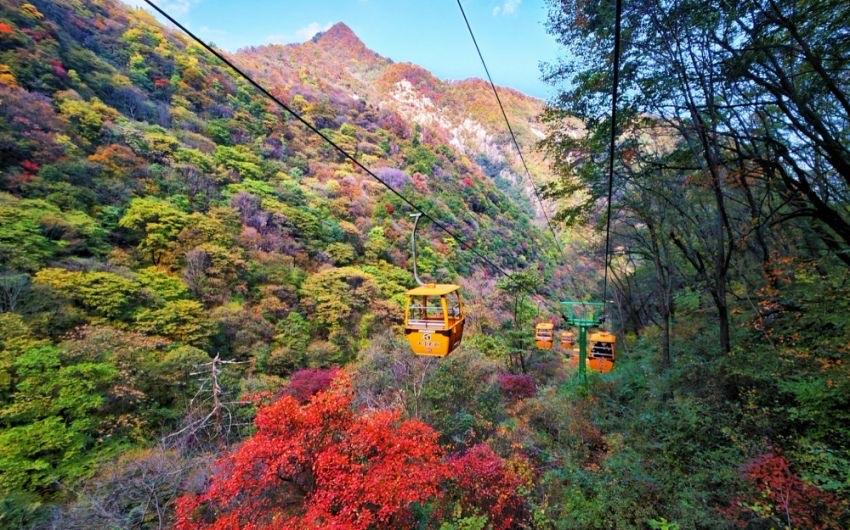 秋冬之交,園內(nèi)的楓葉、黃櫨等樹葉逐漸變色,漫山遍野的紅葉如火焰般絢爛,似云霞般奪目,與翠綠的松柏、金黃的銀杏交織在一起,構(gòu)成一幅幅絕美的畫卷。