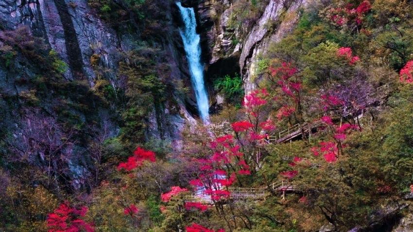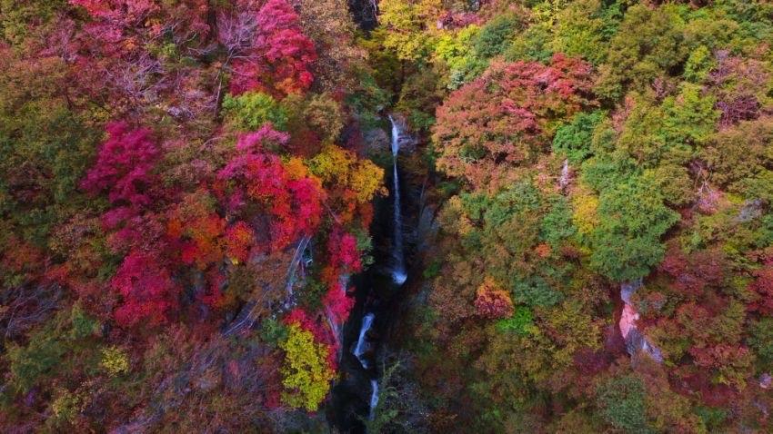 園內(nèi)有眾多瀑布,如彩虹瀑布、仙鶴橋瀑布等,瀑布飛瀉而下,激起層層水霧,在紅葉的映襯下更顯靈動(dòng)。從空中俯瞰,瀑布猶如銀針貫穿于萬木之中,與周圍的山巒、樹木共同構(gòu)成了山水相依的自然景觀。